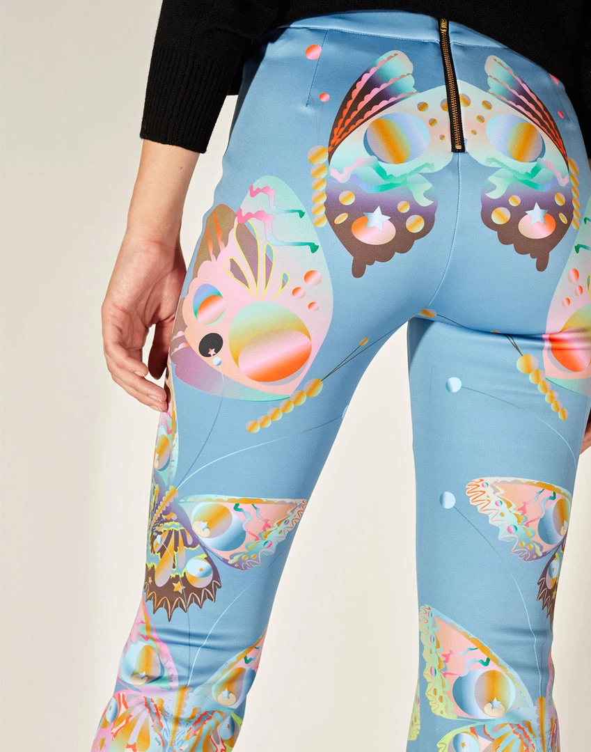 High-waisted butterfly printed bonded flare pant.