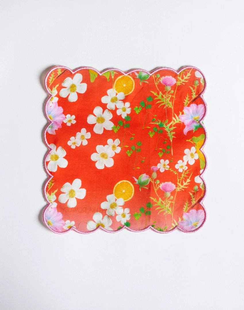 Printed cotton cocktail napkins with scallop embroidered edge.