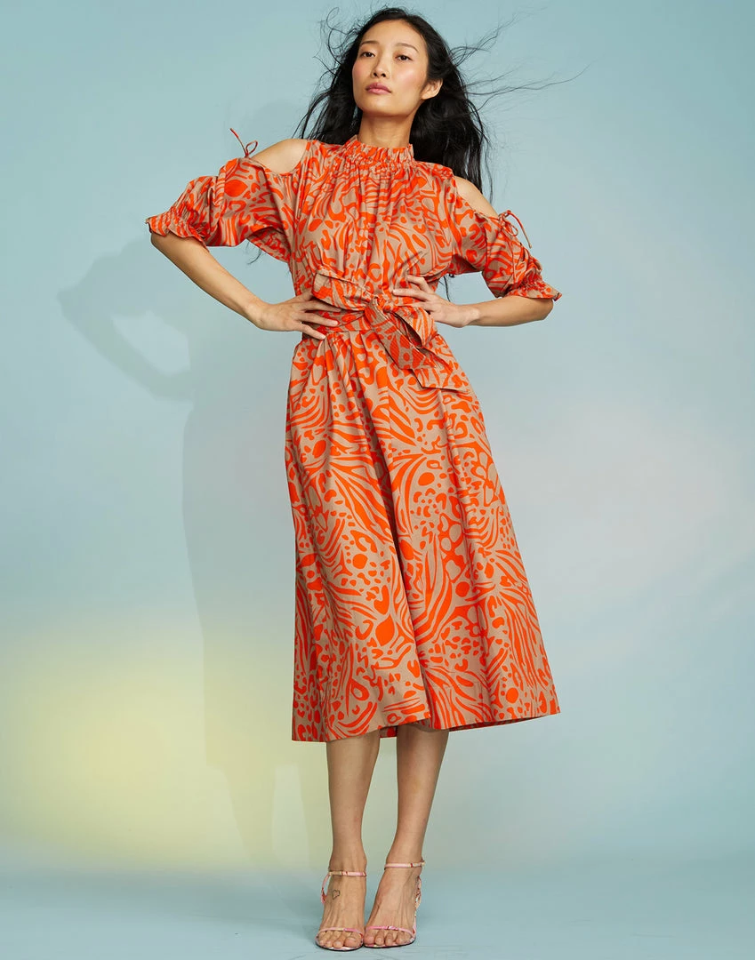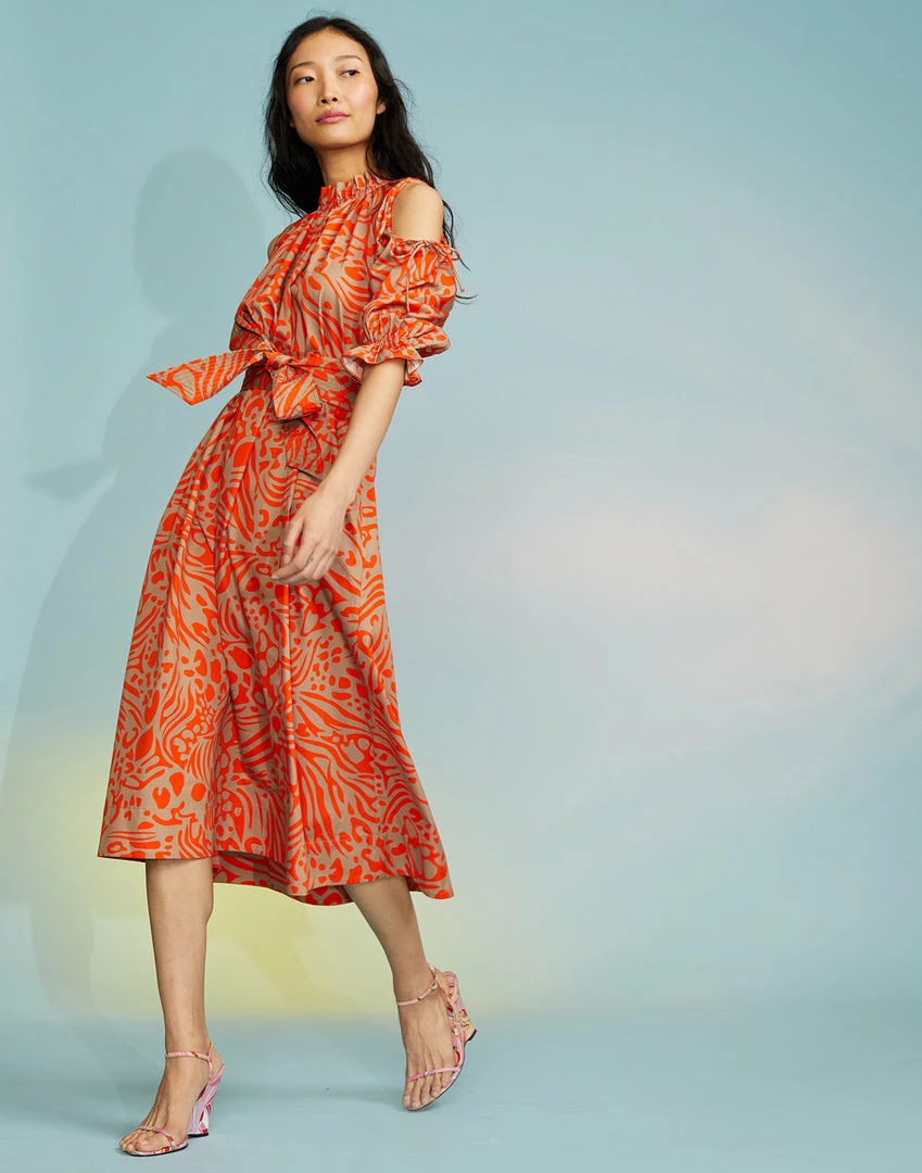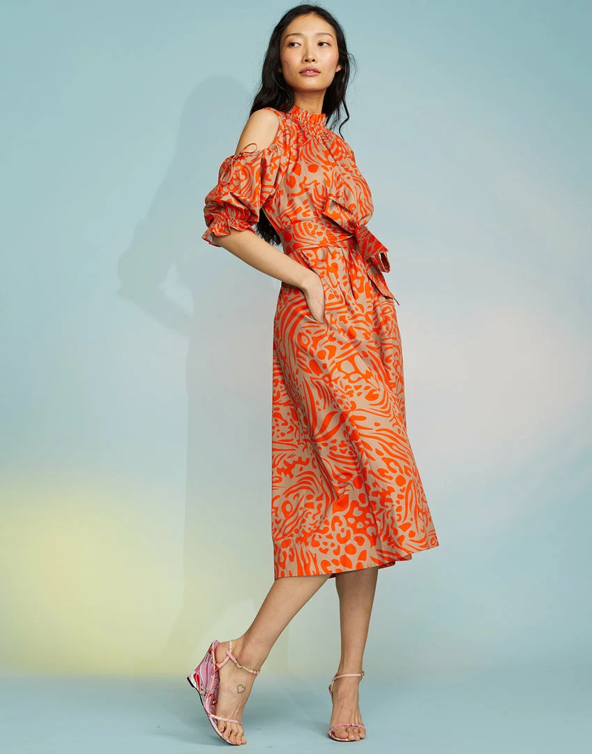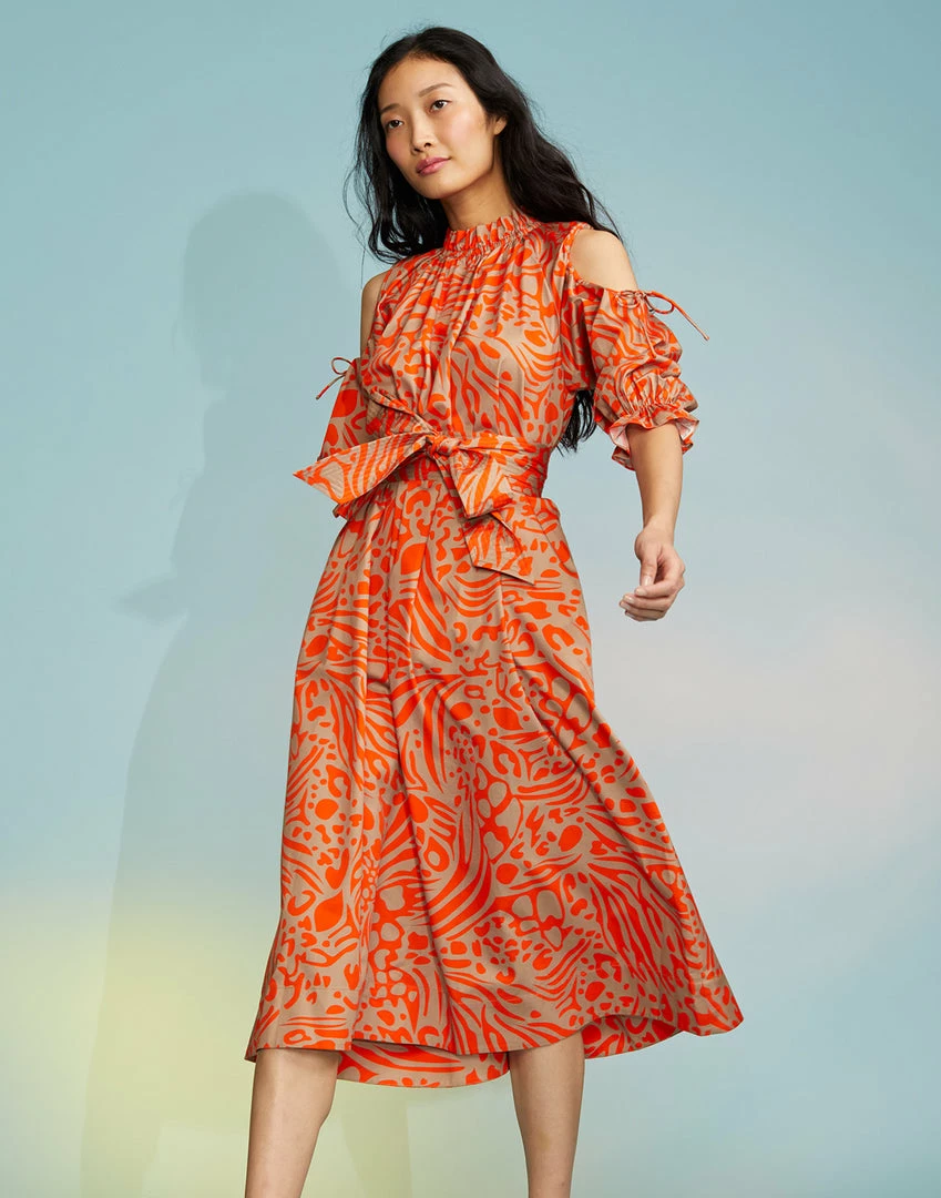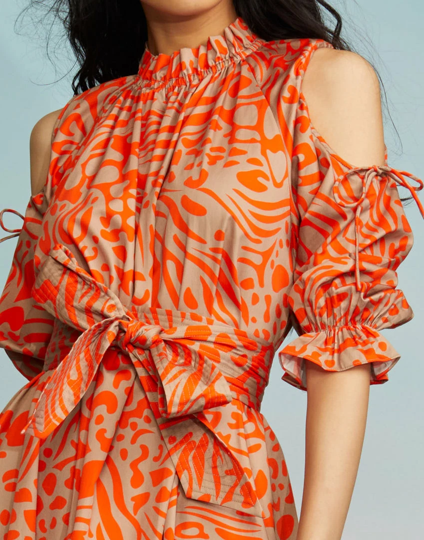 Abstract print midi dress with cut out shoulder detail.
