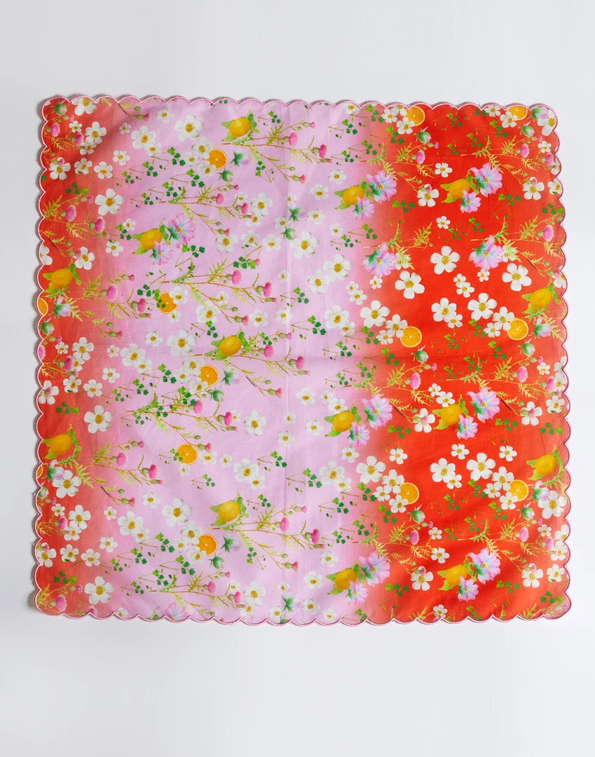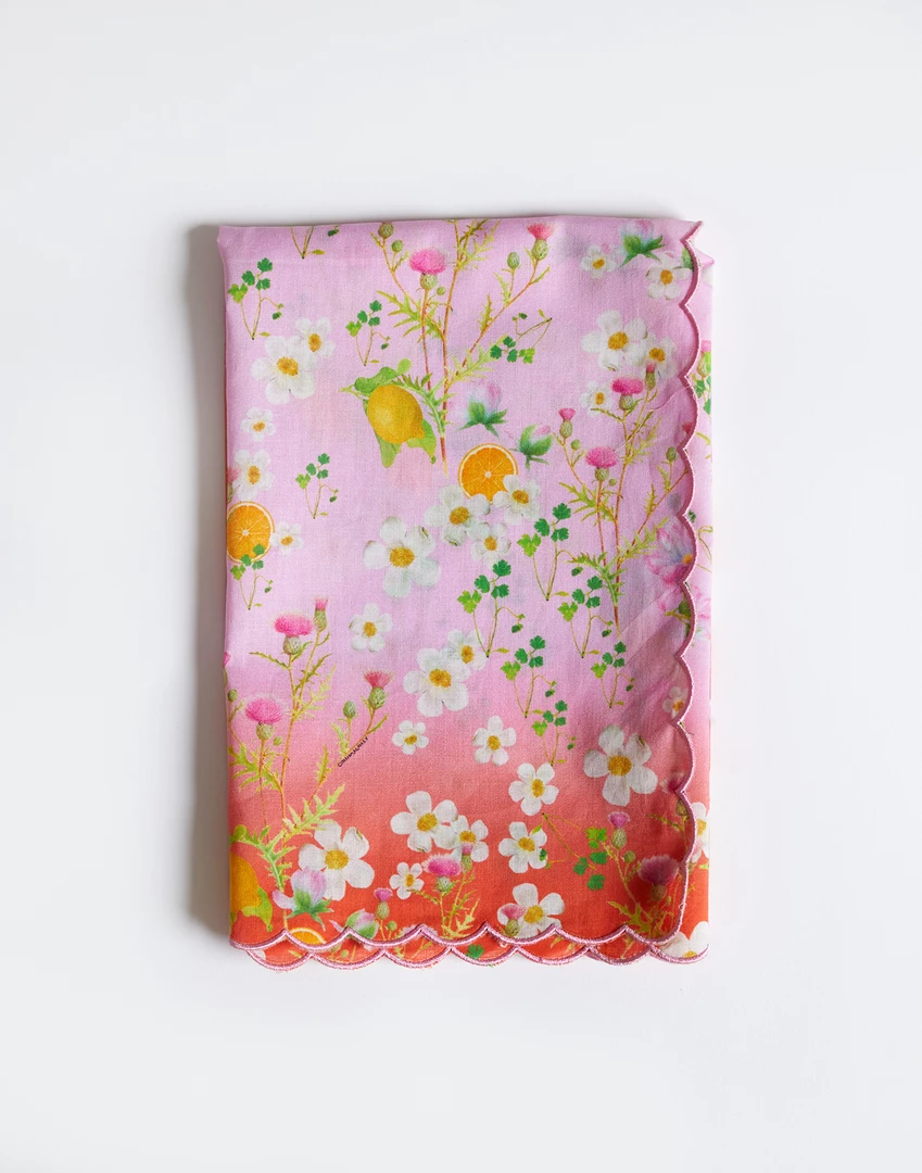 Printed cotton dinner napkins with scallop embroidered edge.Â