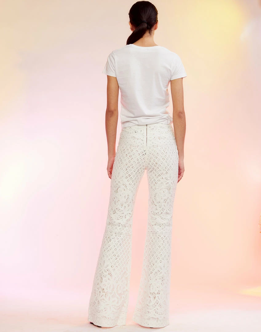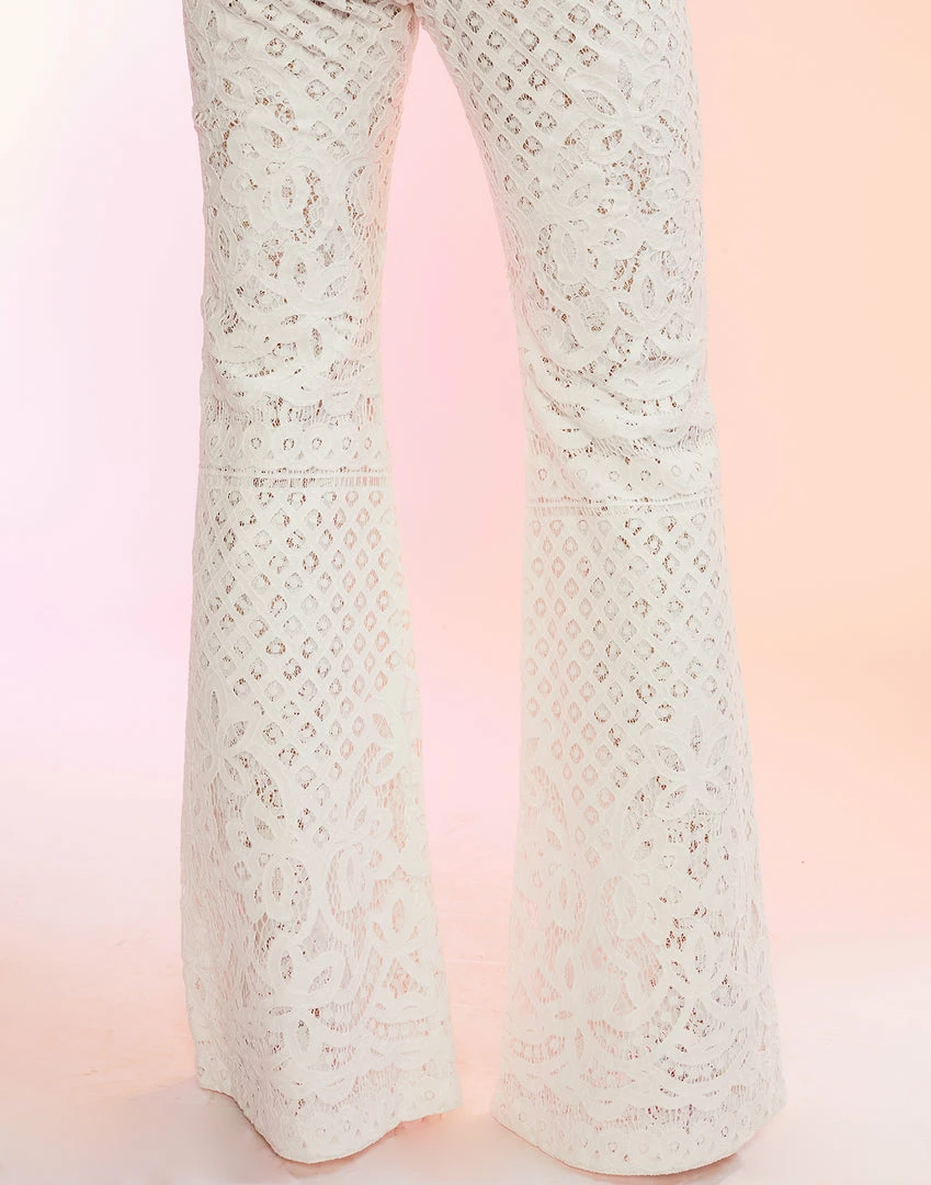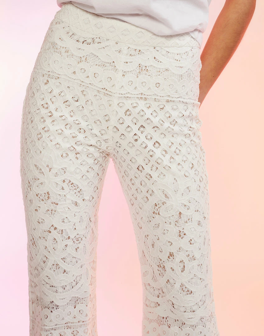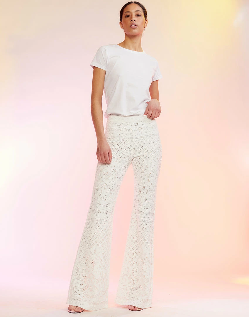 White high-waisted lace fit and slight flare pant.