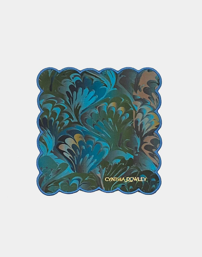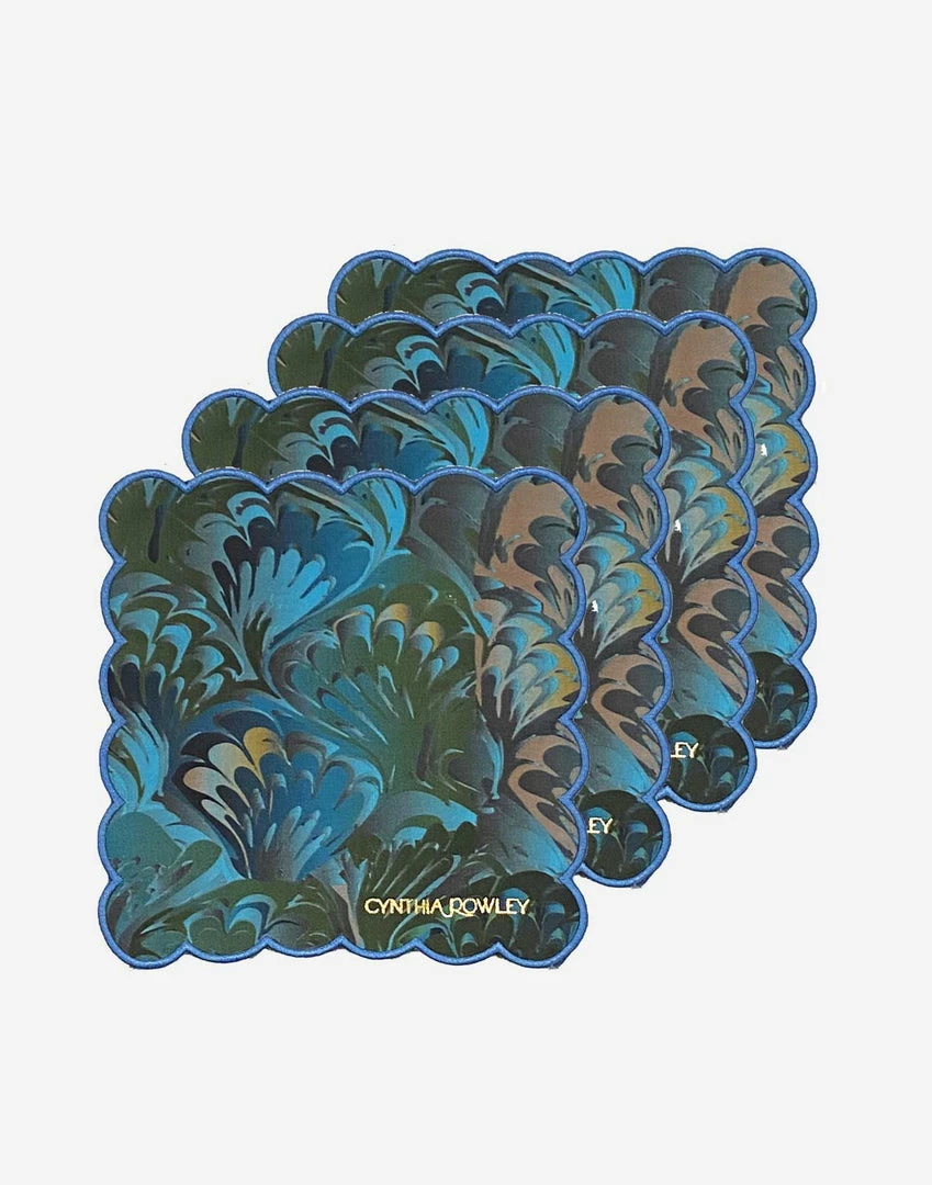 Printed cotton cocktail napkins with scallop embroidered edge.