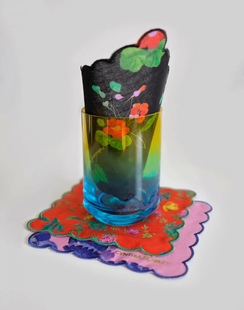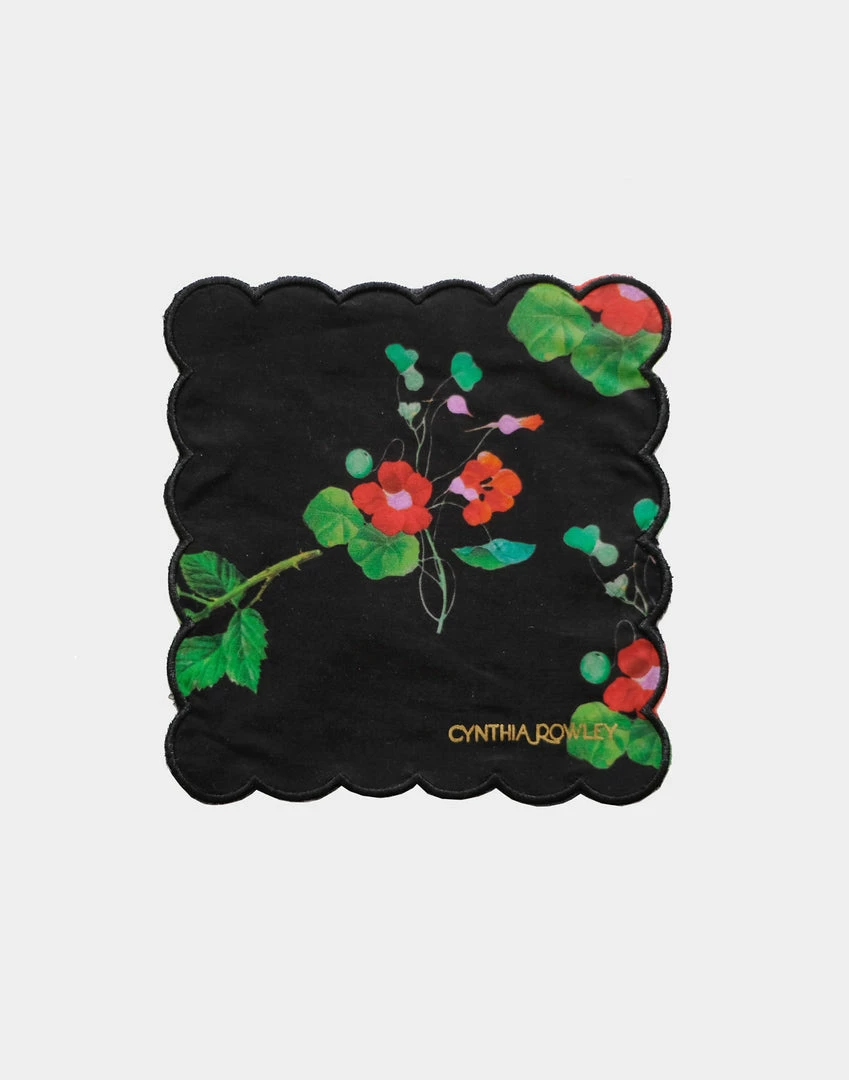 Printed cotton cocktail napkins with scallop embroidered edge.