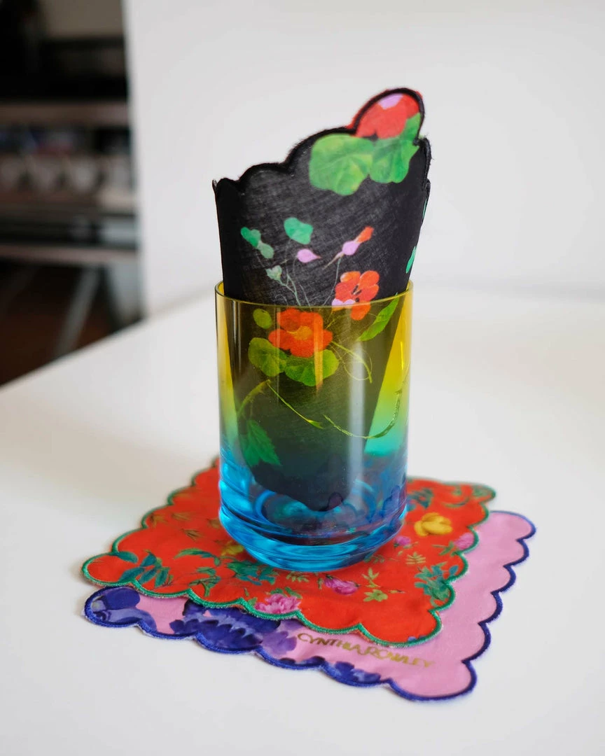 Printed cotton cocktail napkins with scallop embroidered edge.