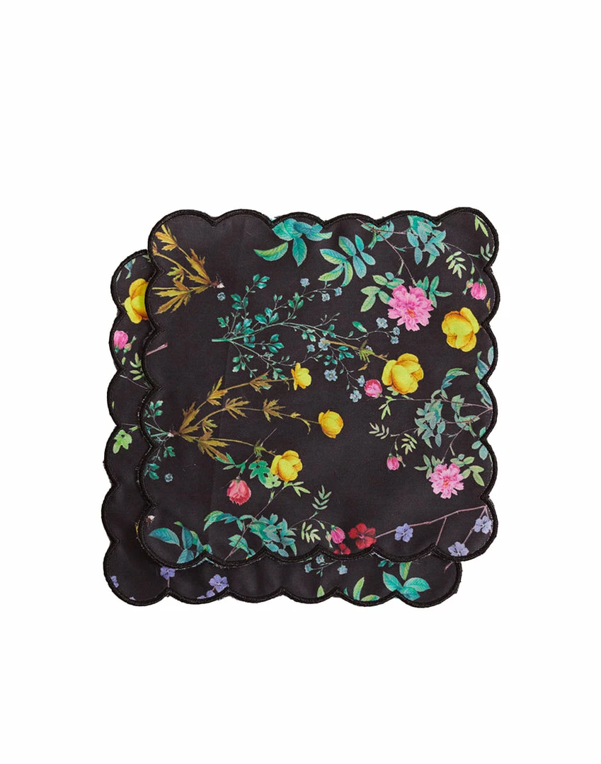 Printed cotton cocktail napkins with scallop embroidered edge.