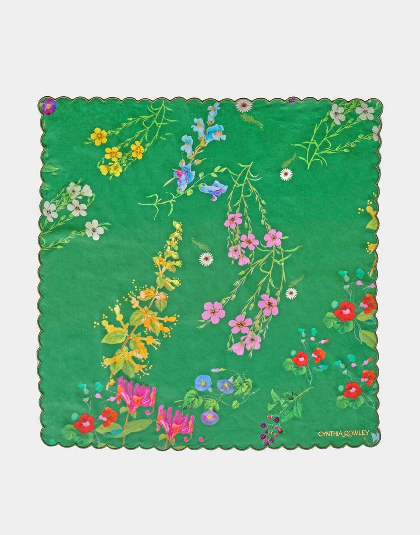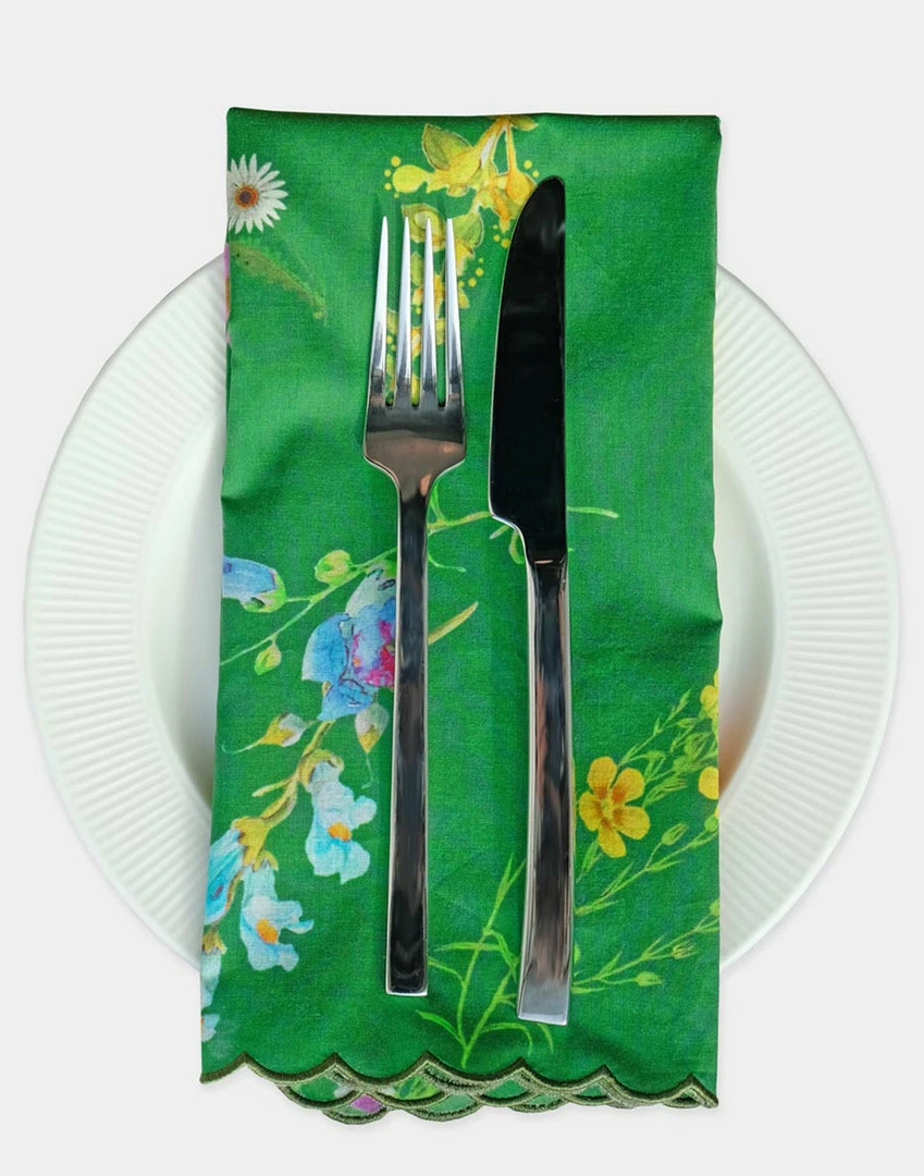 Printed cotton dinner napkins with scallop embroidered edge.Â