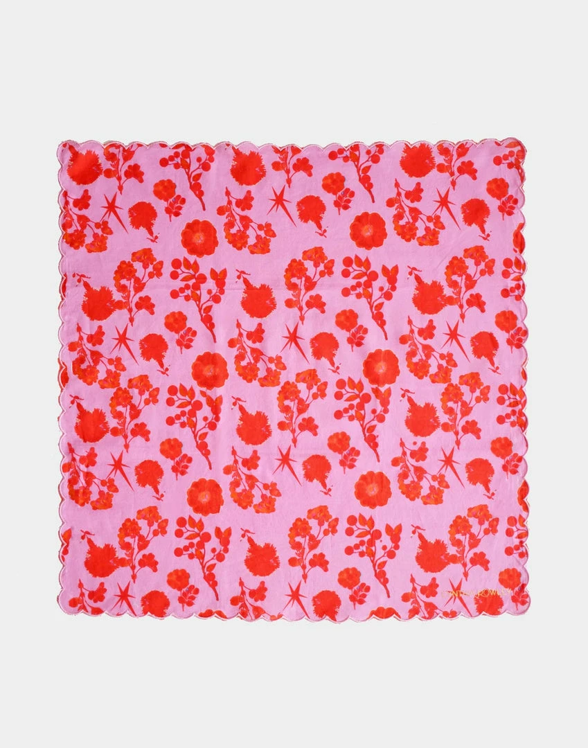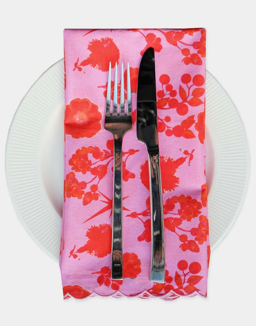 Printed cotton dinner napkins with scallop embroidered edge.Â