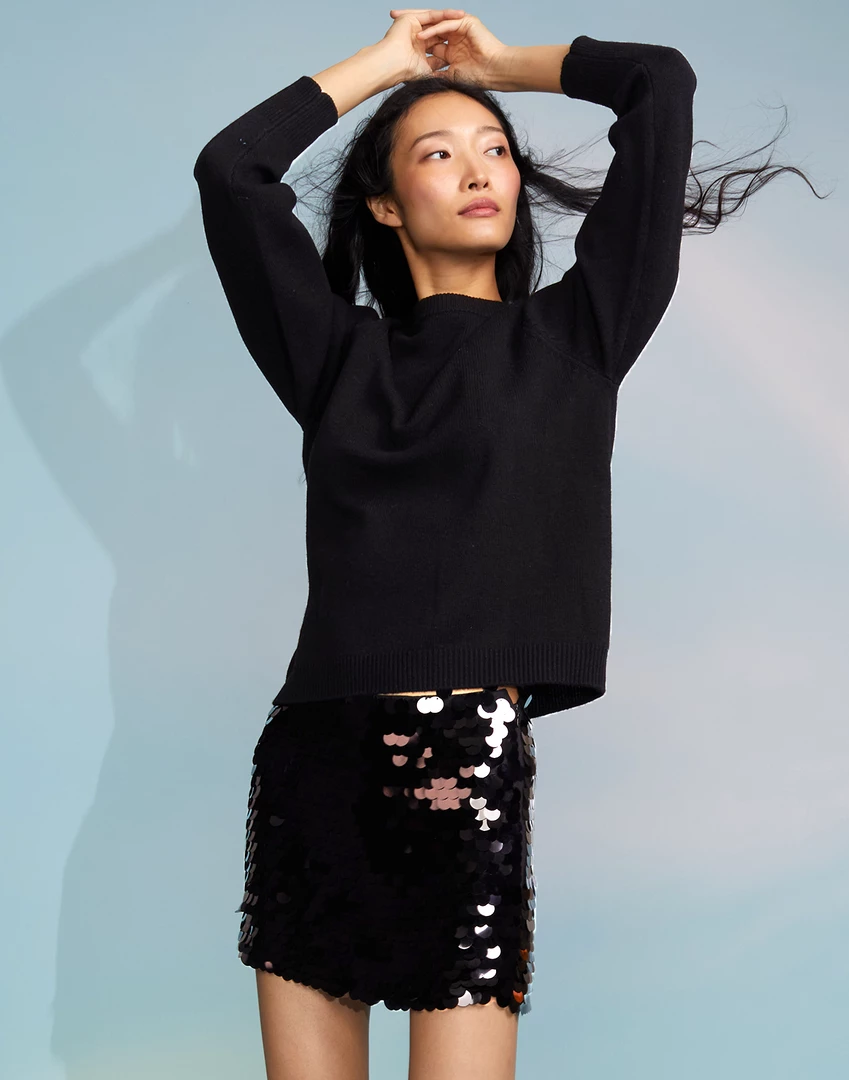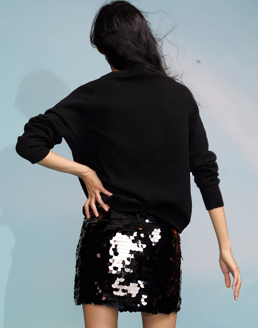 Black sequin mini skirt.