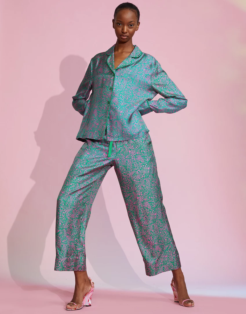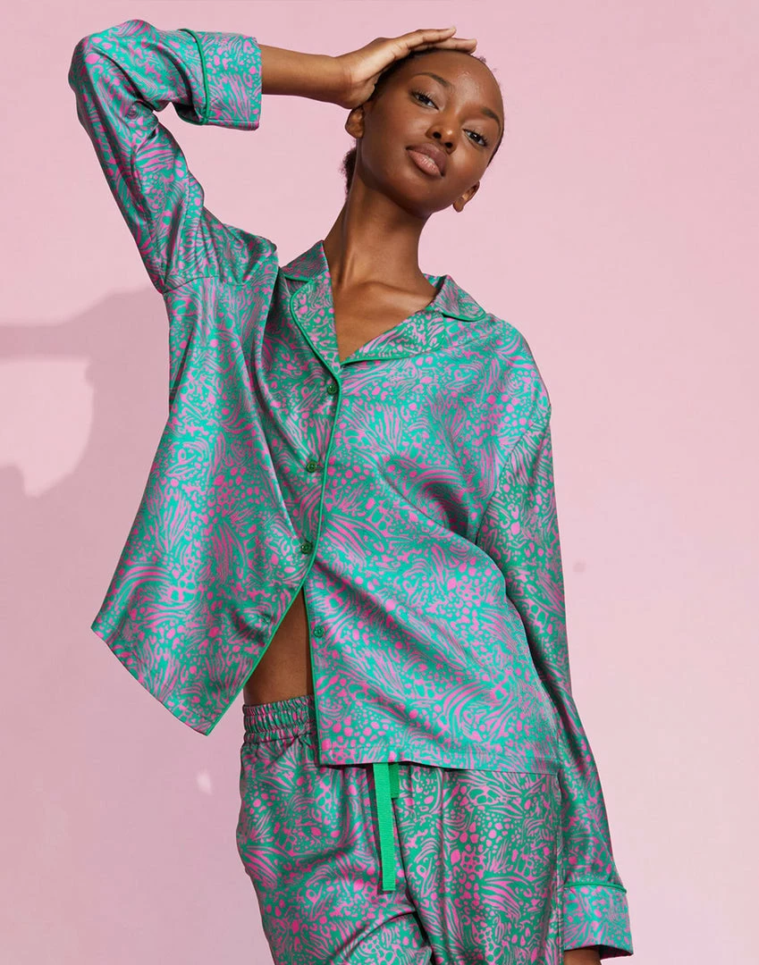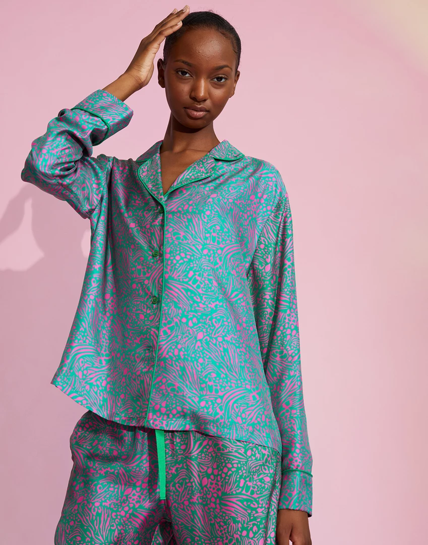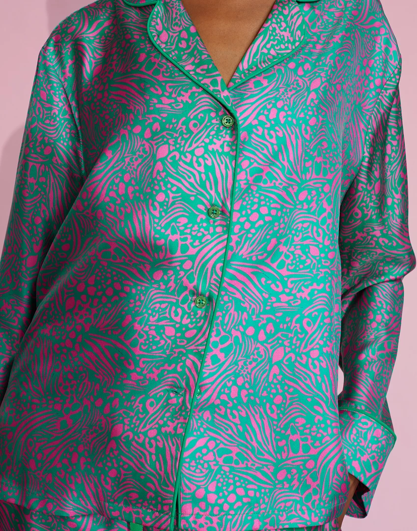 Silk long sleeve pajama shirt with all over graphic print.Â