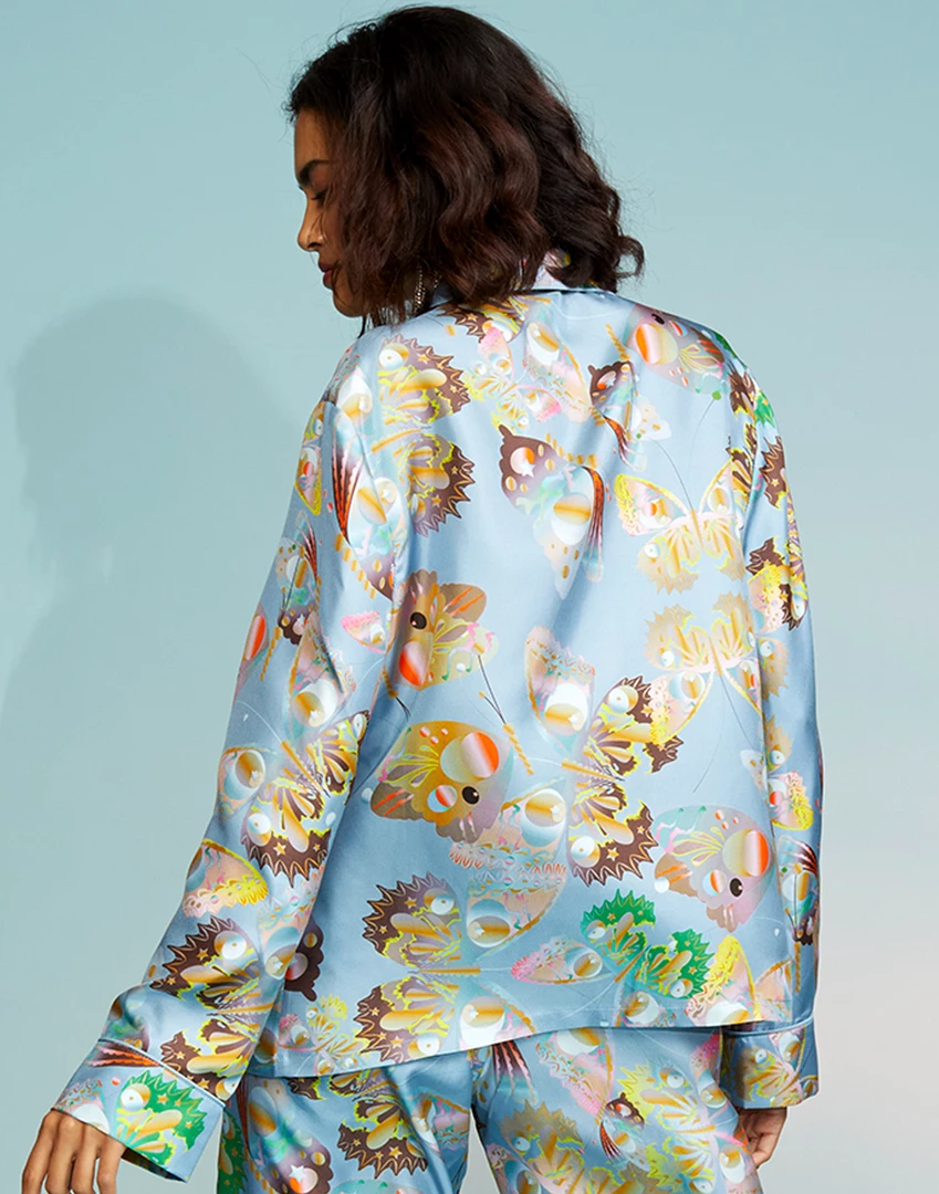 Silk long sleeve pajama shirt with all over butterfly print.Â