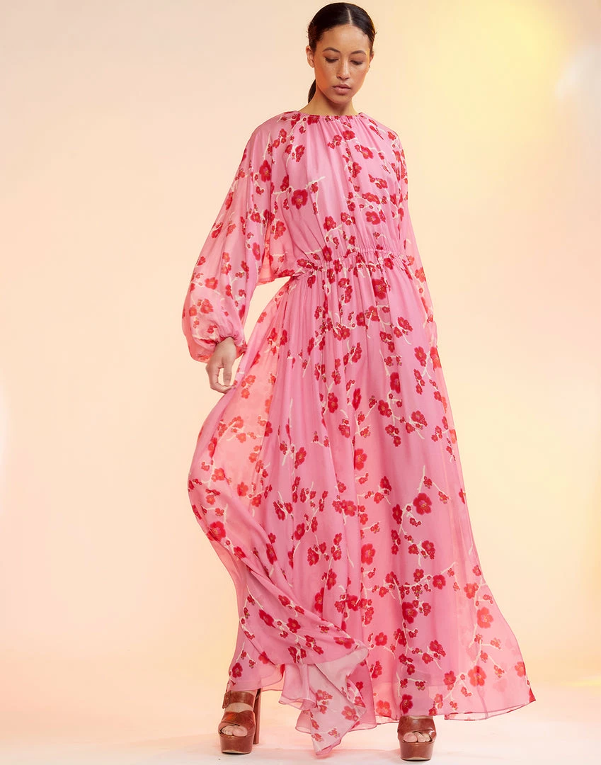 Satin shift dress with floral print and crystal tassels.